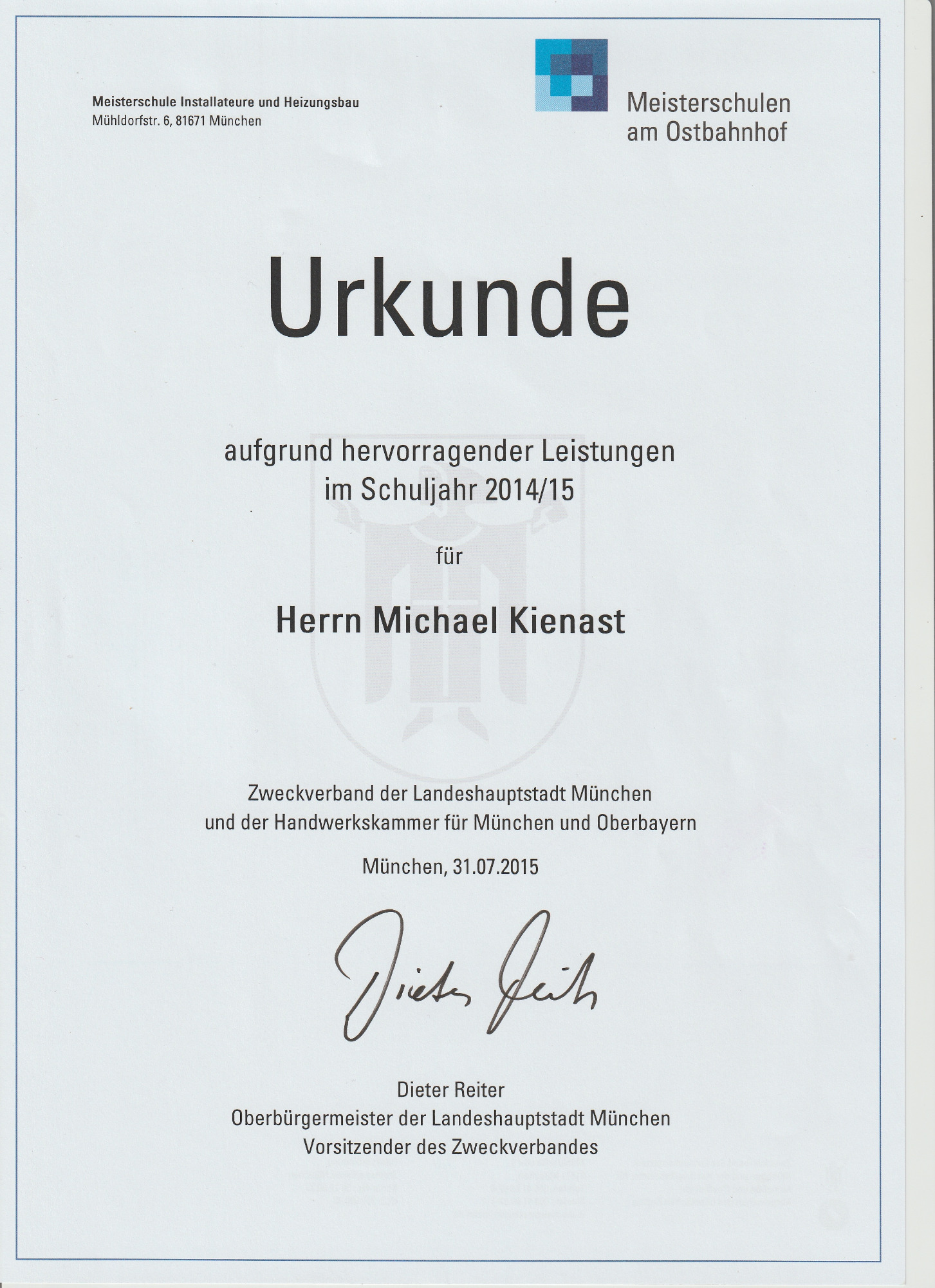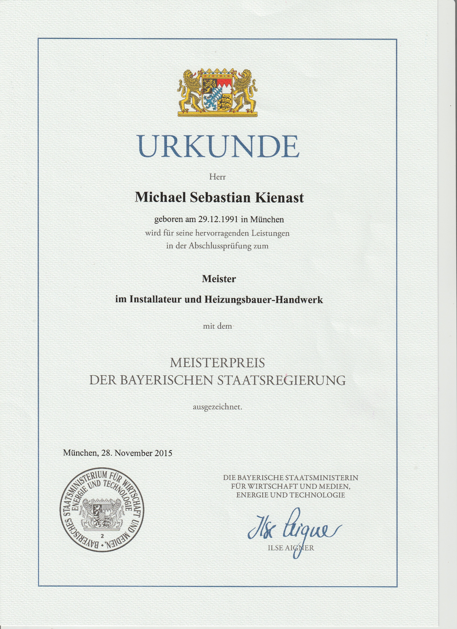 Michael Sebatsian Kienast, Heizungsbaumeister seit 2015